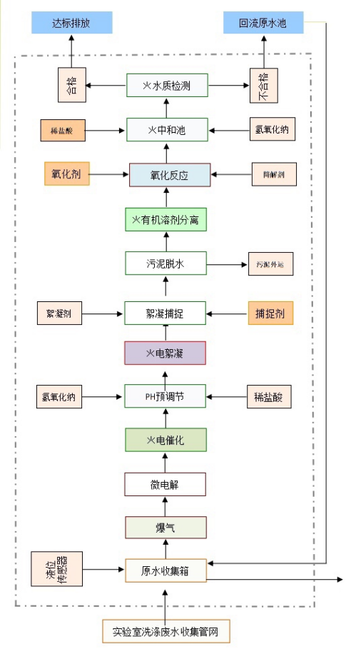 1. 原水收集箱:不同时段、类似实验项目的废水经收集管网自留或泵吸到原水收集箱中,静置一定时间,使其成分稳定、浓度均匀。